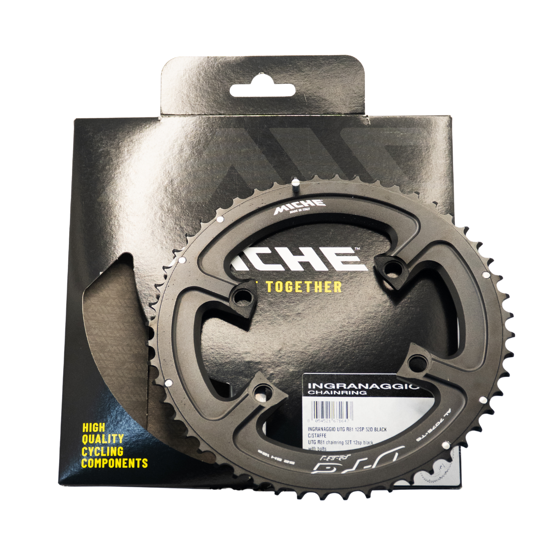Corona Miche de 52 dientes, diseñada para transmisiones Shimano de 12 velocidades. Fabricada en aluminio mecanizado CNC, ofrece alta rigidez, precisión en los cambios y excelente durabilidad.