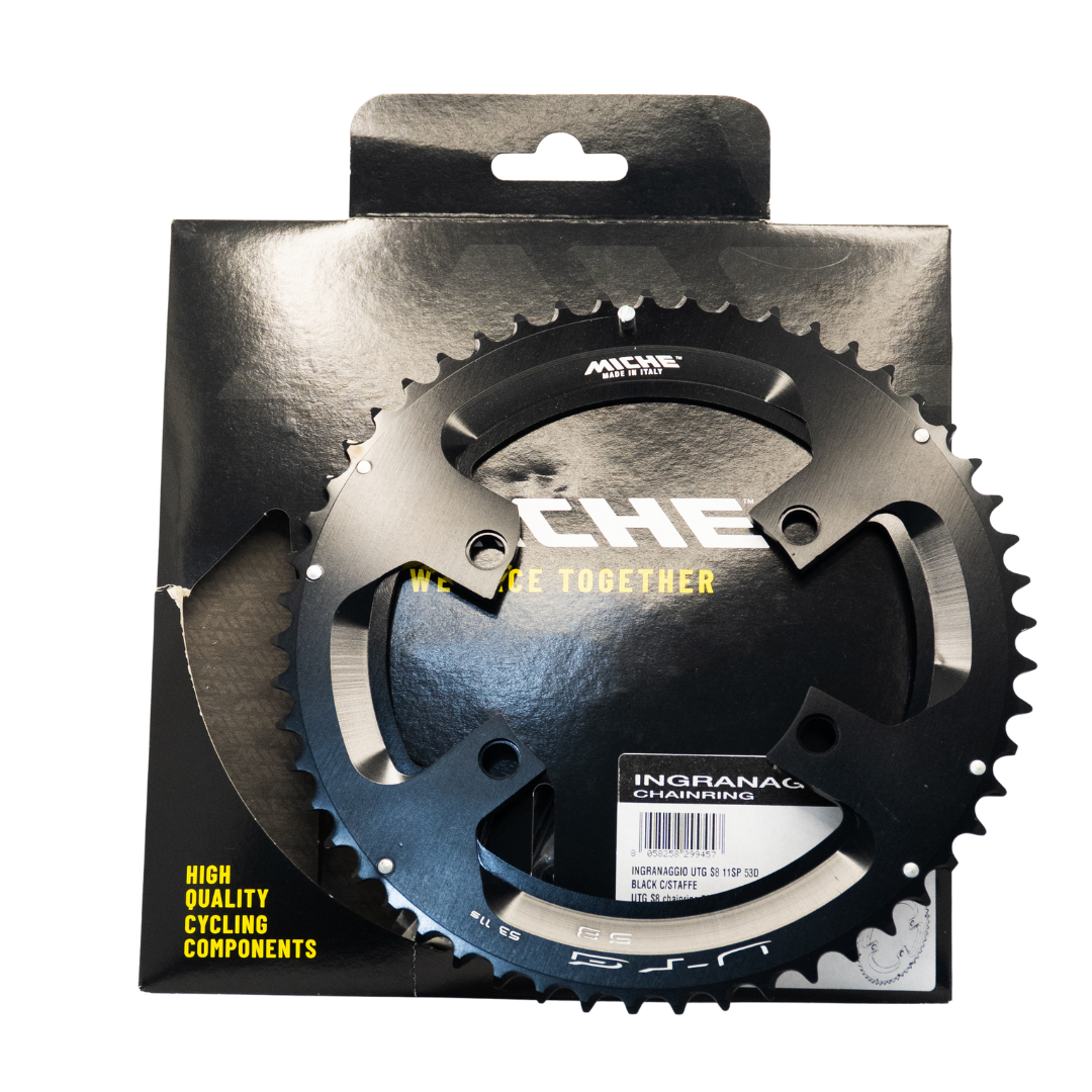Plato Miche de 53 dientes, compatible con grupos Shimano de 11 velocidades. Su diseño Boxed mejora la rigidez lateral, ideal para sprints y esfuerzos de alta potencia. Fabricado en aluminio de alta calidad, ofrece precisión, ligereza y durabilidad.